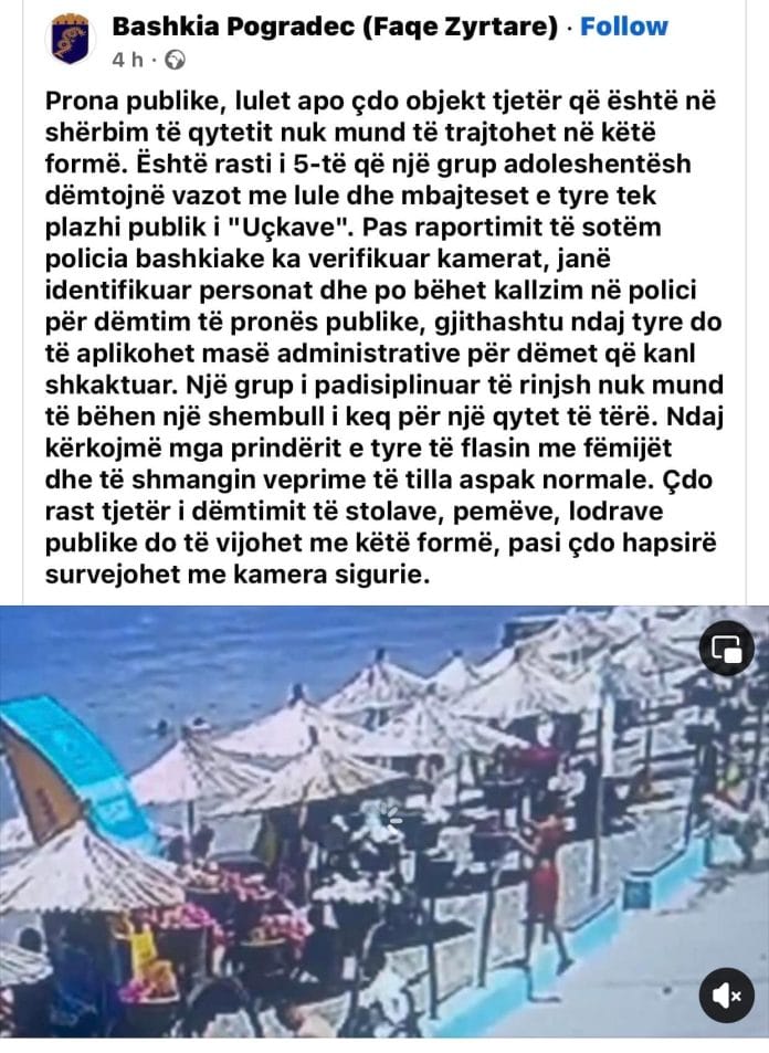 Padyshim është akt i turpshëm dëmtimi i pronës publike, sidomos nga disa të rinj, për të cilët duhen marrë masa konkrete të menjëhershme. Njëherazi e turpshme dhe që kalon kufijtë e një skandali të paralajmëruar nga ana ime edhe më herët, është publikimi i videove të kamerave të sigurisë të vendosura nga Bashkia Pogradec në ambientin përkatës.