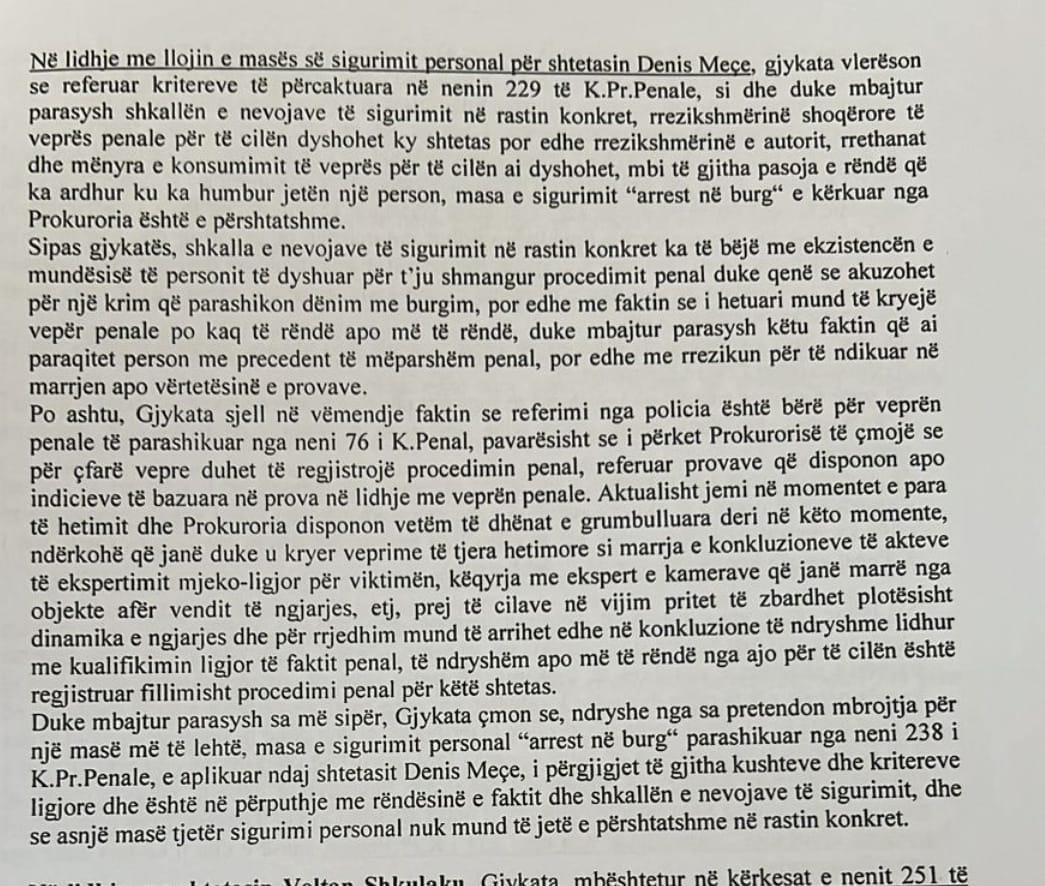 Gjykata refuzoi kerkesen e avokatit te Meces per garanci pasurore. Rrezikshmeri e larte e vepres penale dhe autorit i cili eshte me precedente penale.