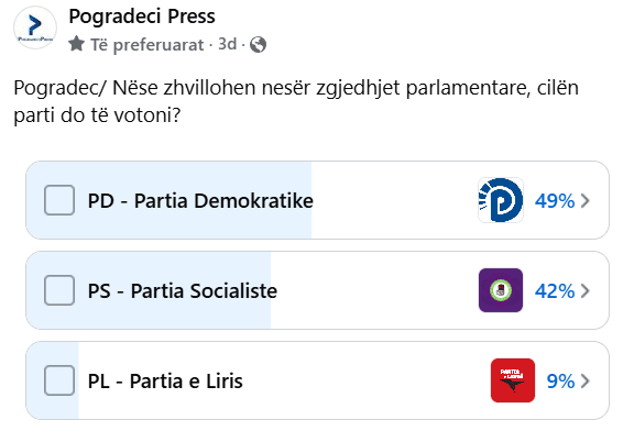 Pogradec – Një anketë e hapur online e zhvilluar nga “Pogradeci Press” në rrjetin social Facebook ka treguar preferencat e votuesve pogradecarë nëse zgjedhjet parlamentare do të zhvilloheshin nesër. Në sondazhin ku morën pjesë 241 persona, të anketuarit janë pyetur për partinë e preferuar mes Partisë Demokratike (PD), Partisë Socialiste (PS) dhe Partisë së Lirisë (PL).